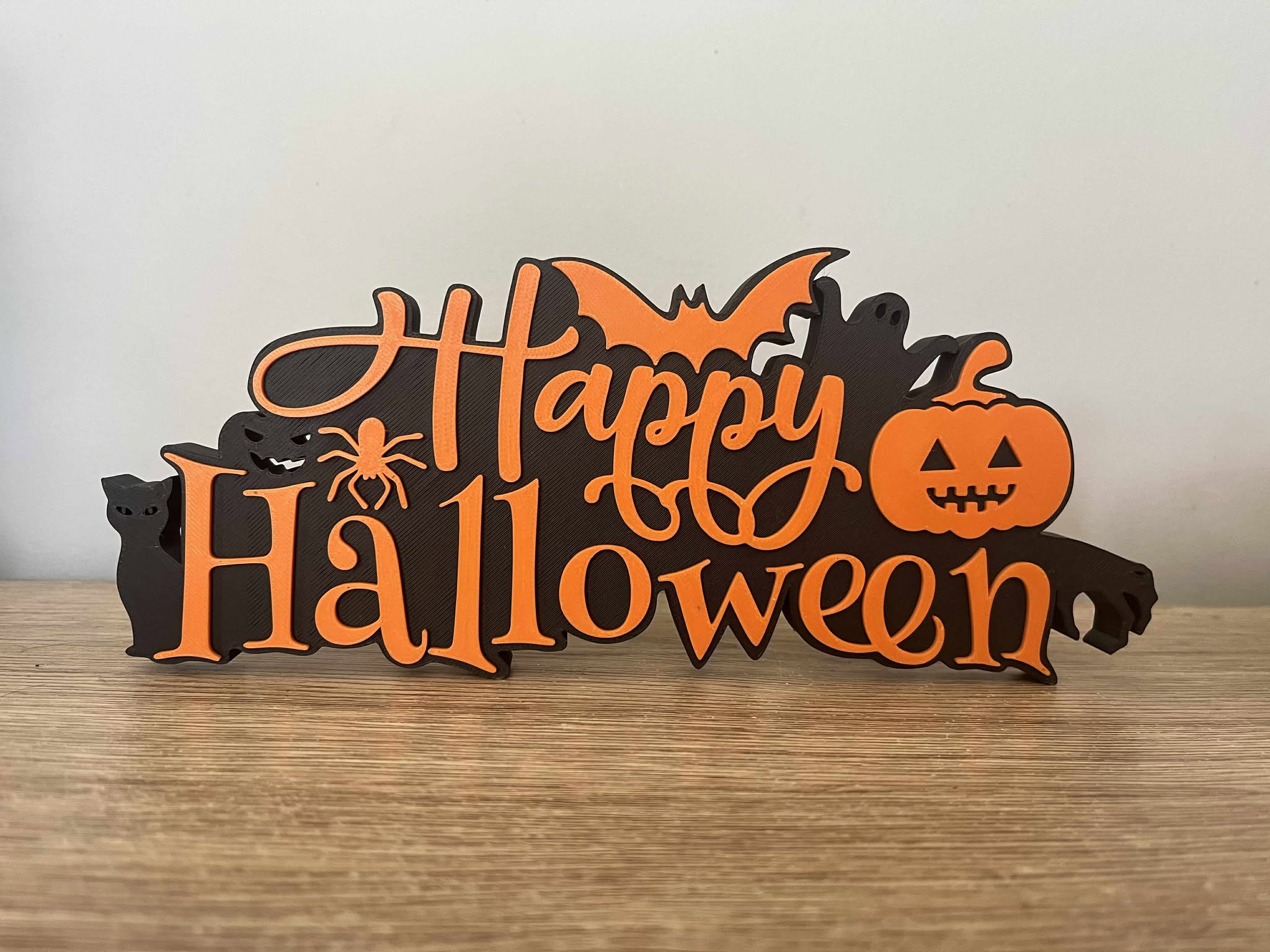 Set the spooky mood with our 3D printed âHappy Halloweenâ sign, the perfect finishing touch for your festive dĂ©cor! Featuring a bold orange and black layered design with cats, bats, spiders, and pumpkins, this sign brings playful Halloween spirit to any space.