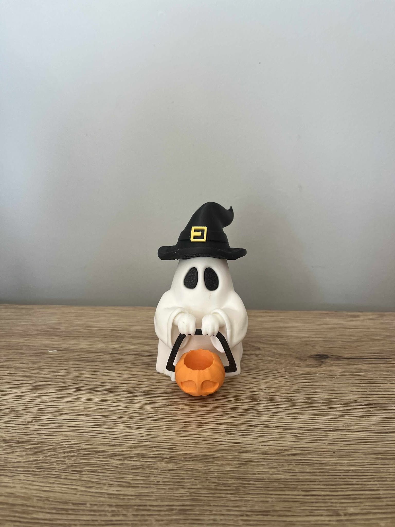 Add a touch of spooky charm to your Halloween setup with this adorable 3D printed Ghost Figurine! Dressed in a classic witch hat and holding a tiny pumpkin bucket, this little ghost is ready for some trick-or-treating magic.